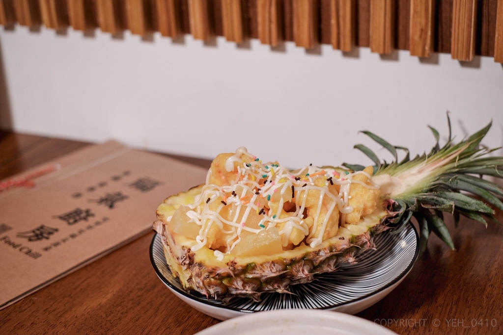 在裡頭填滿了現炸的蝦球及鳳梨果肉